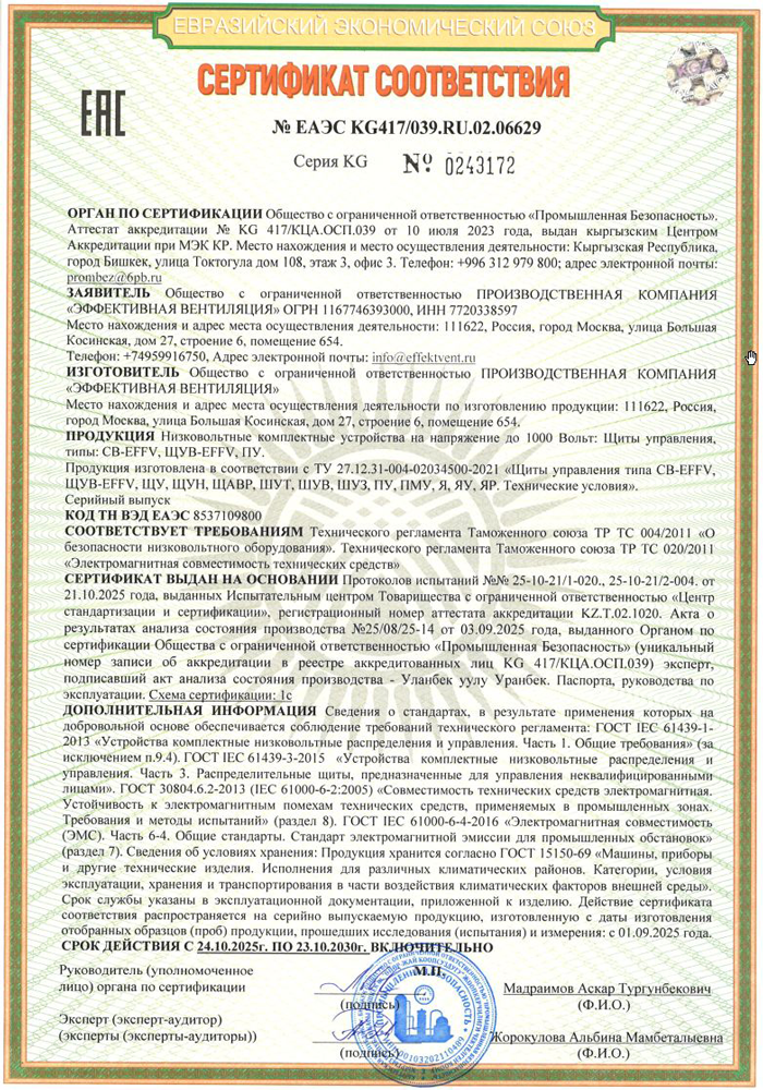 Сертификат соответствия ЕАЭС на НКУ, щиты (шкафы) типа CB-EFFV, ЩУВ-EFFV, ПУ